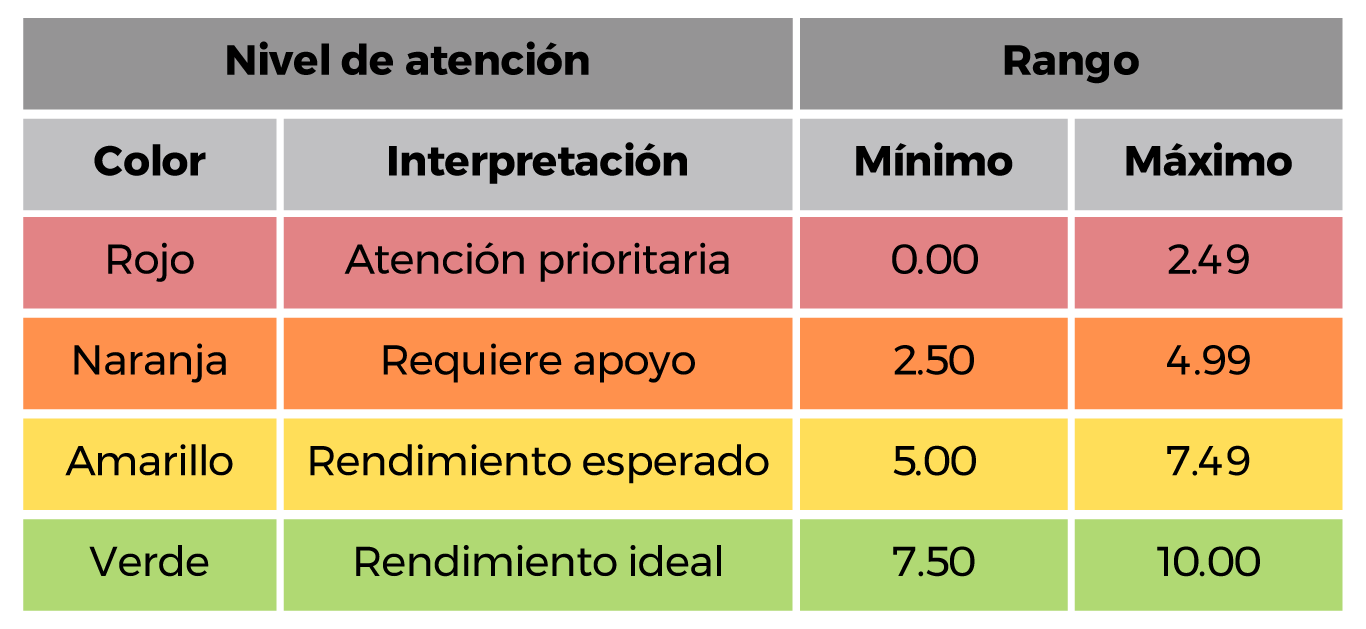 Los niveles del semáforo se definieron tomando como referencia la calificación mínima aprobatoria de 6 en una escala del 0 al 10, siguiendo criterios de la Secretaría de Educación Pública (SEP) y otros organismos educativos.